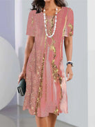 Cette robe pour femme présente une encolure ras du cou et des manches courtes intégrées. La silhouette de longueur moyenne tombe sous le genou avec un ourlet droit. La coupe est standard au niveau du corsage et de la jupe. Le vêtement conserve un drapé régulier de l'épaule à l'ourlet.