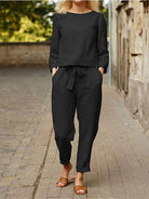 This two-piece linen set for women includes a crop top with long sleeves and a round neck. The matching linen pants feature a fabric belt and functional pockets, combining comfort and practicality in a harmonious design.